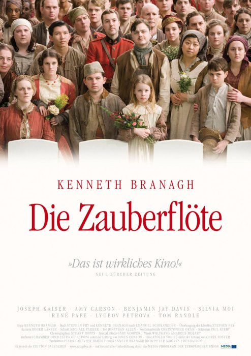 Dieses Filmplakat für Kenneth Branaghs "Die Zauberflöte" zeigt eine Gruppe von Menschen, die in einer Reihe stehen und auf etwas blicken, das außerhalb des Bildes liegt. Im Vordergrund stehen ein Junge und ein Mädchen, die jeweils einen kleinen Blumenstrauß halten. Ihre Kleidung und die Kleidung der Menschen um sie herum deuten auf eine historische oder ländliche Umgebung hin, möglicherweise im frühen 20. Jahrhundert. Die Farbpalette ist gedämpft, mit Brauntönen, Rot und Beige, was eine ernste und nachdenkliche Atmosphäre schafft.
