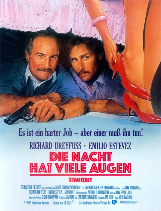 Dieses Filmplakat für "Die Nacht hat viele Augen" (Originaltitel: "Stakeout") zeigt zwei Männer, die unter einem rosa, spitzenbesetzten Stoff hervorlugen. Der Mann auf der linken Seite, Richard Dreyfuss, hat einen ernsten Gesichtsausdruck und hält eine Pistole in der Hand. Der Mann auf der rechten Seite, Emilio Estevez, blickt ebenfalls konzentriert, aber mit einem Hauch von Neugier. Über ihnen sind die Beine einer Frau zu sehen, die einen roten High-Heel-Schuh trägt und ihn mit der Hand festhält.