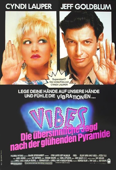 Dieses Filmplakat bewirbt den Film "Vibes - Die übersinnliche Jagd nach der glühenden Pyramide". Im oberen Bereich werden die Hauptdarsteller Cyndi Lauper und Jeff Goldblum prominent präsentiert. Beide blicken mit einer Hand, die sie nach vorne halten, direkt auf den Betrachter. Cyndi Laupers Darstellung ist auffällig, mit ihrem charakteristischen blonden, zerzausten Haar, auffälligem Make-up und auffälligem Schmuck, was ihren exzentrischen Stil widerspiegelt. Jeff Goldblum zeigt einen intensiveren, direkteren Blick.
