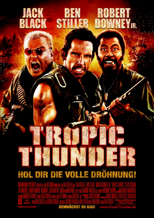 Der Filmtitel "Tropic Thunder" ist in großen, auffälligen Buchstaben in der Mitte des Plakats platziert, mit einem verwitterten, metallischen Aussehen, das an militärische Ausrüstung erinnert. Darunter steht der Slogan "HOL DIR DIE VOLLE DRÖHNUNG!", der die humorvolle und übertriebene Natur des Films andeutet.