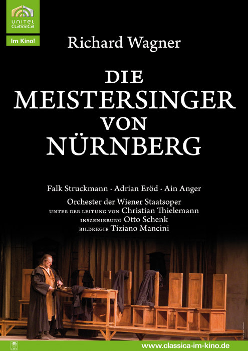 Dieses Filmplakat bewirbt Richard Wagners Oper "Die Meistersinger von Nürnberg". Der Hintergrund ist schwarz und hebt den Titel sowie die Namen der Mitwirkenden hervor. Oben links befindet sich das Logo von Unitel Classica mit der Aufschrift "Im Kino!".