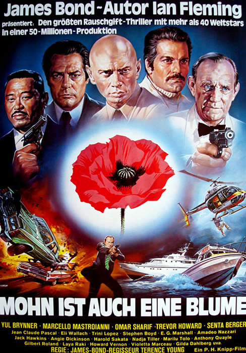 Das Plakat vermittelt effektiv die Kernthemen des Films: die Verlockung und die tödlichen Folgen des Opiumhandels. Die Mohnblume dient als Metapher für die Droge selbst – schön und begehrenswert, aber letztlich zerstörerisch. Die Darstellung von Männern in Machtpositionen und die globalen Actionszenen deuten auf eine komplexe und gefährliche internationale Operation hin. Die Nennung von Ian Fleming als Autor verstärkt die Erwartung eines spannenden Thrillers mit Spionageelementen.