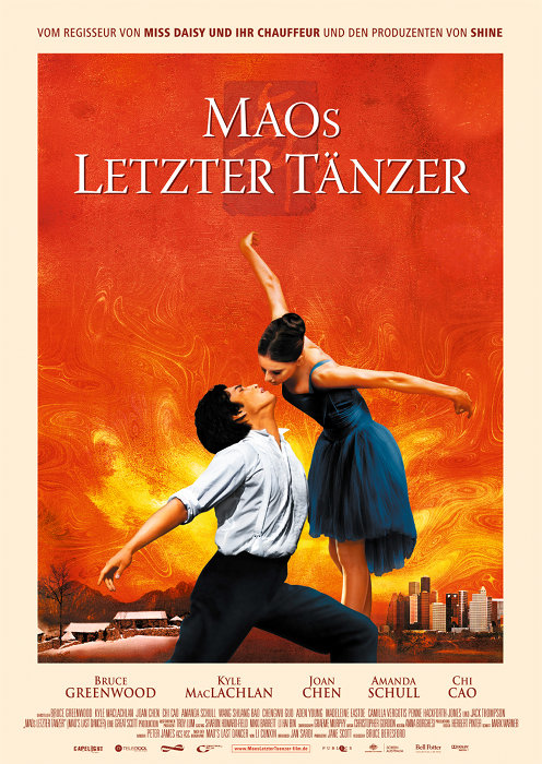 Der Titel "Maos letzter Tänzer" ist prominent in weißer Schrift platziert, was einen starken Kontrast zum roten Hintergrund bildet. Die zusätzliche Zeile "VOM REGISSEUR VON MISS DAISY UND IHR CHAUFFEUR UND DEN PRODUZENTEN VON SHINE" hebt die filmische Qualität und die Herkunft des Films hervor.