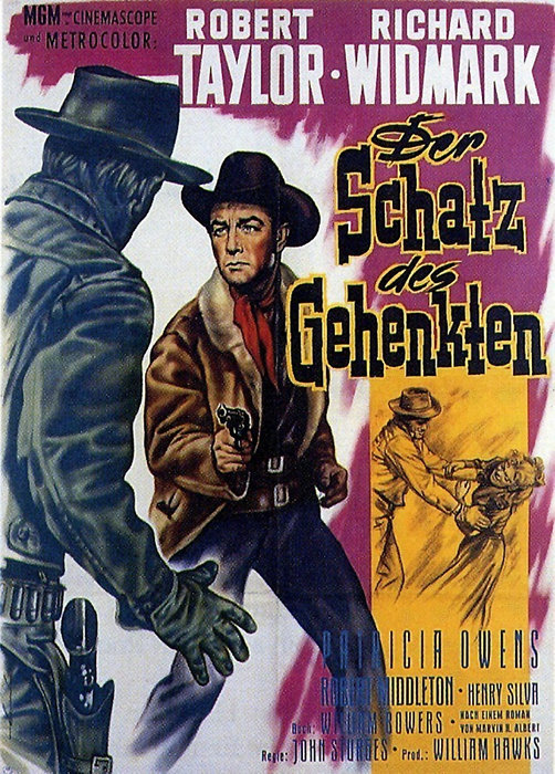 Im oberen Bereich des Plakats sind die Namen der Hauptdarsteller Robert Taylor und Richard Widmark prominent platziert. Der Filmtitel "Der Schatz des Gehenkten" ist in großen, auffälligen Buchstaben in der Mitte des Plakats geschrieben, wobei die Buchstaben eine goldene Farbe mit einem dunklen Rand haben, was ihnen Tiefe verleiht.