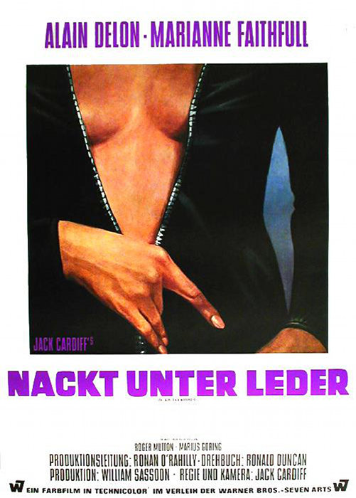 Die Namen der Hauptdarsteller, Alain Delon und Marianne Faithfull, sind in kräftigem Lila über der zentralen Abbildung platziert, was ihre Bedeutung für den Film unterstreicht. Der Filmtitel "Nackt unter Leder" ist ebenfalls in derselben auffälligen lila Farbe gehalten und dominiert den unteren Teil des Plakats. Darunter sind weitere Produktionsdetails wie der Regisseur Jack Cardiff aufgeführt.