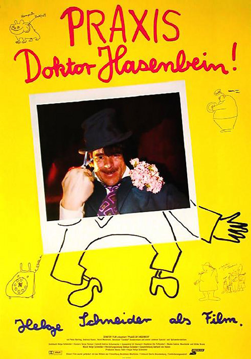 Dieses Filmplakat für "Praxis Dr. Hasenbein" besticht durch sein auffälliges, gelbes Design und eine humorvolle, fast surreale Ästhetik. Im Zentrum steht ein Polaroid-Foto eines Mannes, der einen schwarzen Zylinder trägt und mit einer Schere in der Hand und einem Blumenstrauß auf der Schulter in die Kamera blickt. Seine Mimik und die Art, wie er die Schere hält, deuten auf eine exzentrische oder vielleicht sogar leicht bedrohliche Persönlichkeit hin.