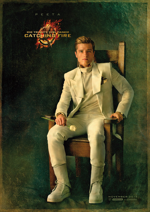 Die Gesamtkomposition strahlt eine Mischung aus Eleganz und Verletzlichkeit aus. Der weiße Anzug und die weiße Rose könnten Reinheit und Hoffnung symbolisieren, während die dunkle Umgebung und Peetas ernster Ausdruck auf die Gefahren und den emotionalen Aufruhr hinweisen, denen er im Film ausgesetzt ist. Das Plakat fängt effektiv die Essenz von Peetas Charakter in diesem Stadium der Serie ein – ein Symbol der Hoffnung, das jedoch von den brutalen Realitäten von Panem gezeichnet ist. Die Veröffentlichungsinformationen unten links geben den Veröffentlichungsmonat November 2013 an.