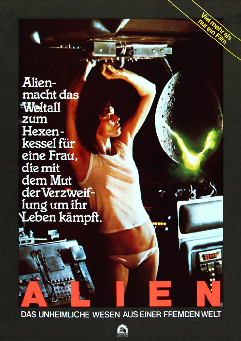 Dieses Filmplakat für "Alien - Das unheimliche Wesen aus einer fremden Welt" strahlt eine intensive Atmosphäre der Bedrohung und des Überlebenskampfes aus. Im Zentrum steht eine Frau, dargestellt von Sigourney Weaver als Ripley, die sich in einer angespannten Haltung befindet, während sie mit einer Maschine interagiert. Ihre Kleidung – ein weißes Tanktop und Unterwäsche – deutet auf eine Situation der Verletzlichkeit und des unmittelbaren Kampfes hin.