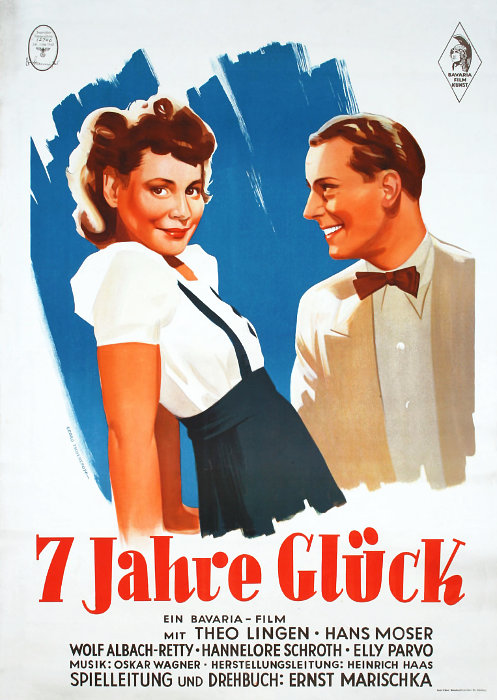 Dieses Filmplakat für "7 Jahre Glück" strahlt eine fröhliche und romantische Atmosphäre aus. Im Mittelpunkt stehen ein junges, lächelndes Paar, das sich gegenseitig anschaut. Die Frau, mit hochgesteckten Haaren und einem charmanten Lächeln, trägt eine weiße Bluse mit Hosenträgern und einen dunklen Rock, was ihr ein jugendliches und verspieltes Aussehen verleiht. Der Mann, elegant in einem hellen Anzug mit Fliege, erwidert ihr Lächeln, was auf eine aufkeimende Romanze hindeutet.
