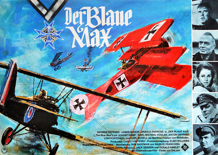 Rechts sind Porträts der Hauptdarsteller abgebildet, die den menschlichen Aspekt des Films hervorheben und einen Einblick in die Charaktere geben, die die Geschichte tragen werden. Die Typografie des Filmtitels "Der Blaue Max" ist im oberen Bereich des Plakats in einer auffälligen, leicht gotisch anmutenden Schriftart gehalten, die dem historischen Setting entspricht.