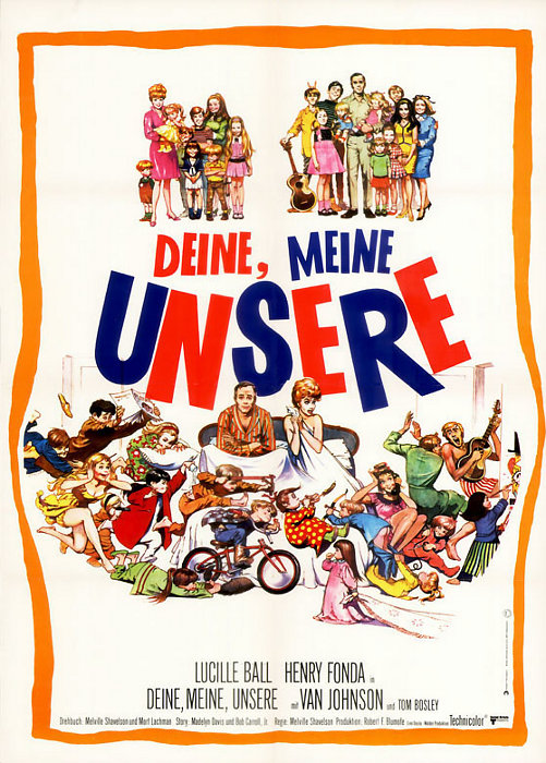 Dieses Filmplakat für "Deine, meine, unsere" (Originaltitel: "Yours, Mine and Ours") strahlt eine lebhafte und chaotische Energie aus, die perfekt zum Thema des Films passt: die Zusammenführung zweier Familien mit insgesamt 18 Kindern.
