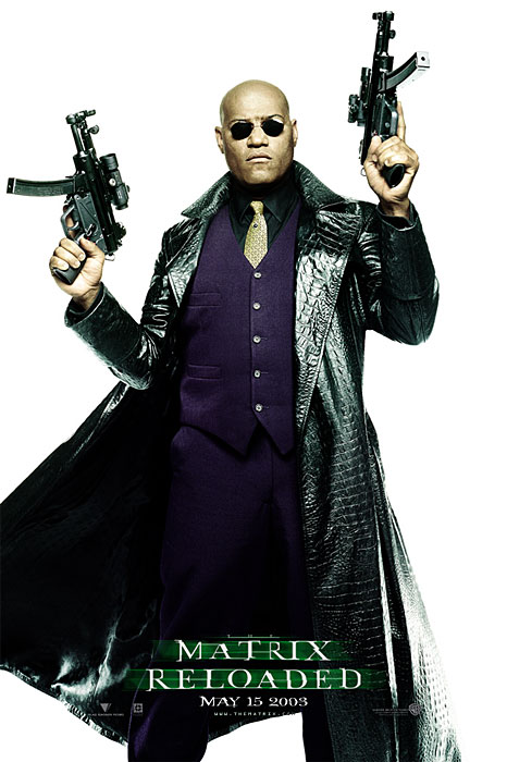 Die Komposition ist auf Morpheus zentriert, mit einem schlichten, weißen Hintergrund, der ihn und seine bedrohliche Präsenz hervorhebt. Die Beleuchtung ist dramatisch und betont die Textur seines Mantels und die scharfen Linien seines Anzugs. Der Titel des Films, "MATRIX RELOADED", ist prominent am unteren Rand platziert, zusammen mit dem Veröffentlichungsdatum "MAY 15 2003" und der Website "www.thematrix.com".