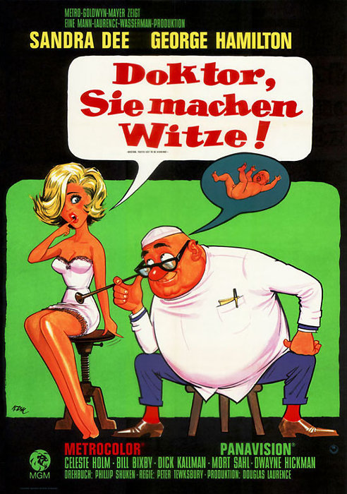 Die Farbgebung ist kräftig und kontrastreich, mit einem dominanten grünen Hintergrund, der die Figuren hervorhebt. Die Zeichnung ist im Stil der 1960er Jahre gehalten, was sich in der Darstellung der Charaktere und der Mode widerspiegelt. Der Titel "Doktor, Sie machen Witze!" in Kombination mit den visuellen Elementen verspricht eine leichte Komödie mit satirischen Untertönen. Die Namen der Hauptdarsteller, Sandra Dee und George Hamilton, sind prominent platziert und weisen auf die Besetzung des Films hin.