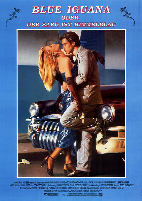 Dieses Filmplakat für "Blue Iguana oder der Sarg ist Himmelblau" strahlt eine Atmosphäre von Verführung, Gefahr und Film Noir aus. Im Zentrum des Bildes stehen ein Mann und eine Frau, die sich in einer leidenschaftlichen Umarmung befinden, vor einem klassischen amerikanischen Auto.