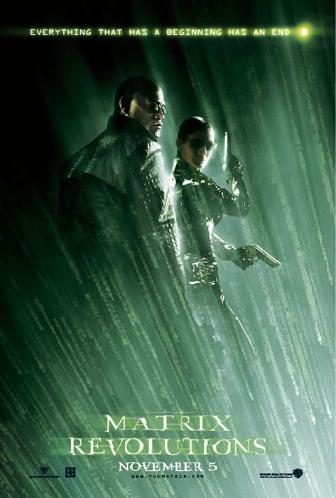 Über den Figuren prangt der Slogan "EVERYTHING THAT HAS A BEGINNING HAS AN END" (Alles, was einen Anfang hat, hat auch ein Ende), der auf die finale Konfrontation und die Auflösung der Geschichte hindeutet. Darunter steht der Filmtitel "MATRIX REVOLUTIONS" und das Veröffentlichungsdatum "NOVEMBER 5".