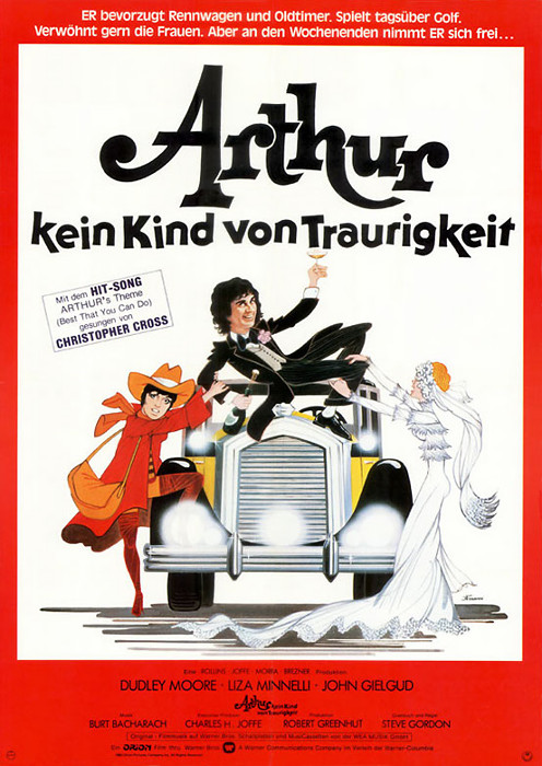 Das Plakat erwähnt auch den "HIT-SONG ARTHUR'S THEME (Best That You Can Do)", gesungen von Christopher Cross, was auf die Bedeutung des Titelsongs für den Film hinweist. Die Nennung der Hauptdarsteller wie Dudley Moore, Liza Minnelli und John Gielgud sowie des Komponisten Burt Bacharach gibt weitere Hinweise auf die Qualität und den Stil des Films.