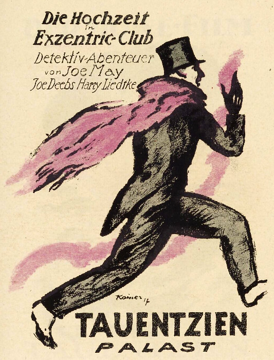 Dieses Filmplakat bewirbt den Film "Die Hochzeit im Excentric-Club", ein Detektivabenteuer von Joe May, mit Joe Deebs und Harry Liedtke. Die Grafik zeigt eine stilisierte Figur in voller Bewegung, gekleidet in einen dunklen Anzug, einen Zylinder und einen auffälligen rosa Schal, der im Wind flattert. Die dynamische Pose und der fließende Schal vermitteln ein Gefühl von Eile und Spannung, typisch für ein Detektivabenteuer.