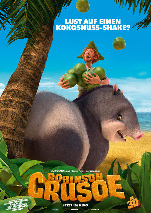Der Slogan "Lust auf einen Kokosnuss-Shake?" in großen, weißen Buchstaben verstärkt den humorvollen und leichtfüßigen Ton des Films. Der Filmtitel "Robinson Crusoe" ist prominent in einem auffälligen, holzartigen Schriftzug dargestellt, der das Thema des Films widerspiegelt. Die Erwähnung von "STUDIOCANAL und nWave Pictures präsentieren" und "JETZT IM KINO" sowie das "IN 3D"-Logo informieren das Publikum über die Produktionsfirmen und die Verfügbarkeit des Films.