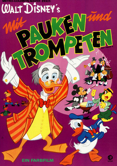 Der Hintergrund ist in einem kräftigen Lila gehalten, was die leuchtenden Farben der Charaktere und des Titels hervorhebt. Der Filmtitel "Mit Pauken und Trompeten" ist in großen, auffälligen Buchstaben geschrieben, wobei "Pauken" und "Trompeten" in einem lebhaften Grün mit schwarzer Umrandung hervorgehoben sind. Oben links sind die Logos von "Walt Disney" und "Metro-Goldwyn-Mayer zeigt" zu sehen, was auf die Produktions- und Verleihfirmen hinweist. Unten links steht "EIN FARBFILM", was die technische Qualität des Films zu seiner Zeit unterstreicht.