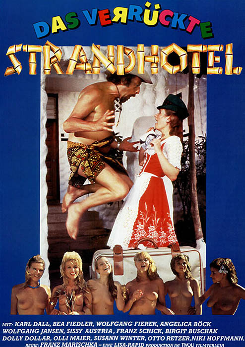 Das Filmplakat für "Das verrückte Strandhotel" strahlt eine humorvolle und leicht provokante Atmosphäre aus, die typisch für Komödien der 1980er Jahre ist. Im Zentrum des Plakats springt ein Mann in einem hawaiianisch anmutenden Lendenschurz und mit einem Cowboyhut auf dem Kopf in die Luft. Seine Mimik und Gestik deuten auf eine übertriebene, komödiantische Aktion hin. Ihm gegenüber steht eine Frau in Tracht, die ihn mit einer Mischung aus Überraschung und Belustigung ansieht.