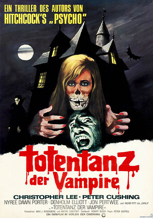Dieses Filmplakat für "Totentanz der Vampire" (im Original "The Vampire Lovers") strahlt eine düstere und unheilvolle Atmosphäre aus, die typisch für Horrorfilme der Hammer-Ära ist.