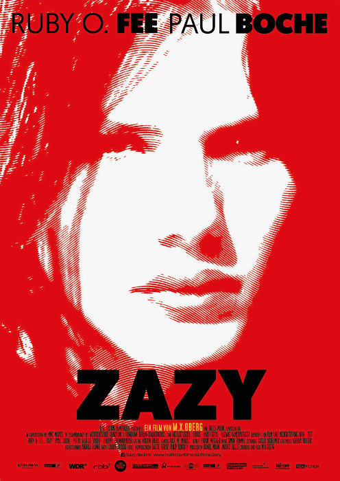 Typografie und Layout: Die Namen der Hauptdarsteller, "RUBY O. FEE PAUL BOCHE", sind in Großbuchstaben am oberen Rand des Plakats platziert. Der Filmtitel "ZAZY" steht prominent in fetten, schwarzen Großbuchstaben im unteren Drittel des Plakats. Die Platzierung und Größe des Titels machen ihn sofort erkennbar und unterstreichen seine Bedeutung. Darunter befindet sich eine Reihe von kleineren Texten, die Informationen über die Produktion, die Crew und die Website des Films enthalten.