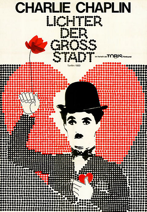 Die Komposition ist stark von Punkten geprägt, die sowohl für die Darstellung Chaplins als auch für den Hintergrund verwendet werden. Ein großes, rotes Herz, das aus unzähligen roten Punkten gebildet wird, dominiert den Hintergrund und symbolisiert die zentrale Rolle von Liebe und Romantik im Film. Links von Chaplins Kopf schwebt eine einzelne, rote Blume, die von einer Hand gehalten wird, die ebenfalls aus Punkten geformt ist. Dies ist eine direkte Anspielung auf die berühmte Szene, in der der Tramp der blinden Blumenverkäuferin eine Blume schenkt.