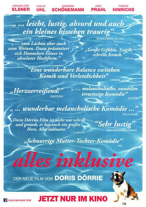 Der Filmtitel "alles inklusive" ist in auffälligem Rot hervorgehoben, was seine Bedeutung unterstreicht. Darunter steht "DER NEUE FILM VON DORIS DÖRRIE", was die Regisseurin und ihre frühere Arbeit hervorhebt. Am unteren rechten Rand des Plakats ist ein Französischer Bulldogge zu sehen, der dem Ganzen eine charmante und unerwartete Note verleiht. Die Botschaft "JETZT NUR IM KINO" und das Facebook-Logo mit dem Filmnamen signalisieren die aktuelle Verfügbarkeit und die Marketingstrategie des Films. Insgesamt vermittelt das Plakat ein Bild eines vielschichtigen, emotionalen und unterhaltsamen Films, der zum Nachdenken anregt.