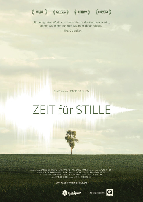 Über dem Baum und dem Feld erstreckt sich eine stilisierte Darstellung einer Schallwelle, die sich von links nach rechts erstreckt und in der Mitte ihren Höhepunkt erreicht, bevor sie wieder abflacht. Diese visuelle Darstellung von Klang oder dessen Fehlen ist ein starkes Symbol für das Thema des Films. Der Titel "ZEIT für STILLE" ist prominent in der Mitte platziert, in einer schlichten, grünen Schrift, die mit der Farbe des Feldes harmoniert.