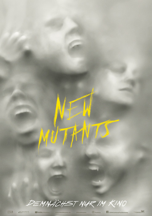 Dieses Filmplakat für "New Mutants" ist düster und beunruhigend. Es zeigt mehrere Gesichter, die durch eine milchige, nebelartige Substanz verzerrt und verschwommen sind. Die Gesichter scheinen in Angst und Schrecken zu schreien, ihre Münder weit geöffnet, die Augen geschlossen oder voller Qual. Die Farbgebung ist fast ausschließlich in Grautönen gehalten, was die bedrückende und unheimliche Atmosphäre verstärkt.