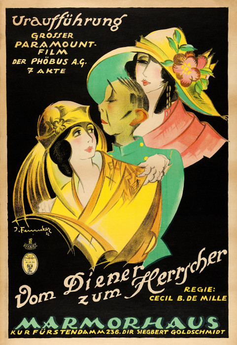 Typografie und Informationen: Die Überschrift "Uraufführung" und der Filmtitel "Vom Diener zum Herrscher" sind in einer eleganten, geschwungenen Schriftart gehalten, die typisch für die Zeit ist. Weitere Informationen wie "GROSSER PARAMOUNT-FILM", "DER PHÖBUS A.G.", "7 AKTE", "REGIE: CECIL B. DE MILLE" und der Spielort "MARMORHAUS KUR FÜRSTENDAMM 236. DIR SIEGBERT GOLDSCHMIDT" sind klar und gut lesbar platziert. Das Plakat trägt auch die Signatur des Künstlers "J. Fenneker", was auf die künstlerische Qualität des Designs hinweist.