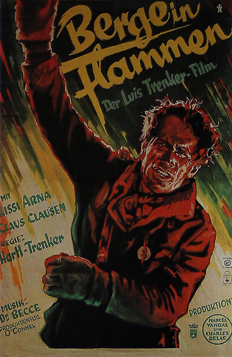 Der Titel "Berge in Flammen" ist in einer auffälligen, gelben Schrift gehalten, die sich vom dunklen Hintergrund abhebt. Darunter steht "Der Luis Trenker-Film", was auf die Beteiligung des bekannten Bergfilmregisseurs und Schauspielers Luis Trenker hinweist. Die Farbgebung ist intensiv, mit starken Kontrasten zwischen Rot-, Gelb- und Grüntönen, die die dramatische Atmosphäre des Films unterstreichen.