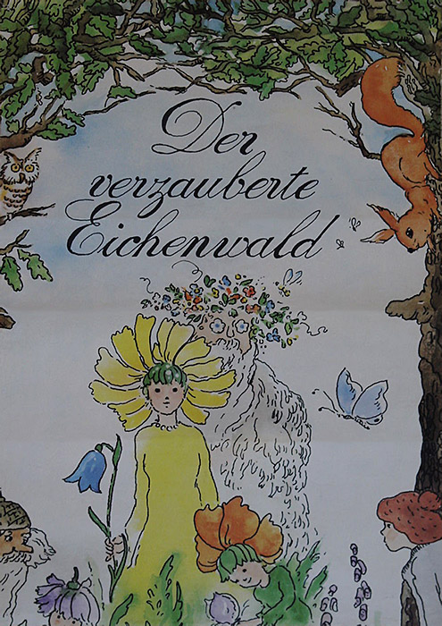 Die Farbpalette ist hell und freundlich, mit vielen Grüntönen für das Laub, warmen Gelb- und Orangetönen für die Blumen und Figuren sowie einem sanften Blau für den Himmel und den Schmetterling. Die gesamte Komposition vermittelt ein Gefühl von Naturverbundenheit, Kindlichkeit und dem Zauber des Waldes. Das Plakat lädt den Betrachter ein, in eine Welt voller Wunder und Fantasie einzutauchen.