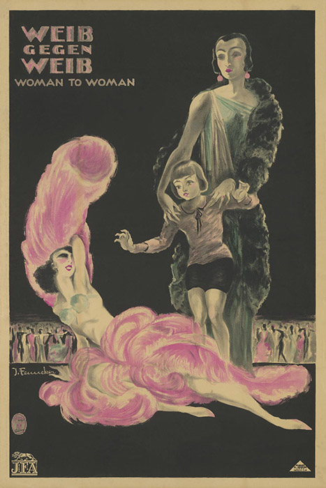 Der Titel "Weib gegen Weib" und die englische Übersetzung "Woman to Woman" deuten auf ein Thema wie Rivalität, Abhängigkeit oder die komplexen Beziehungen zwischen Frauen hin, möglicherweise im Kontext von Liebe, Gesellschaft oder Beruf. Die Komposition und die Darstellung der Figuren lassen auf einen Film schließen, der sich mit weiblichen Schicksalen und sozialen Dynamiken auseinandersetzt, typisch für die progressive und oft provokative Kunst und Filmkultur der Weimarer Zeit. Die Signatur "J. Faurecker" und das "JFA"-Logo verweisen auf die Urheber und die Produktionsfirma.