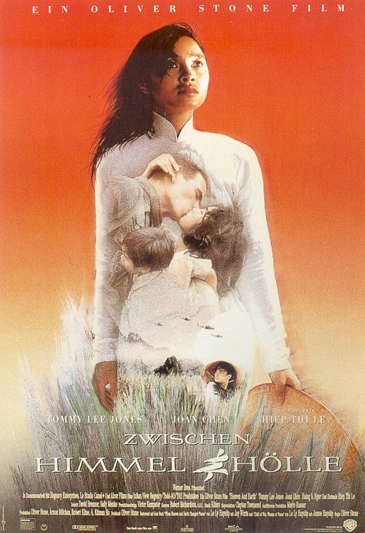 Dieses Filmplakat für "Zwischen Himmel und Hölle" (Heaven & Earth) von Oliver Stone ist eine visuell eindringliche Darstellung des Films. Im Zentrum steht eine junge vietnamesische Frau, die in traditioneller Kleidung gekleidet ist und mit ihrem Blick nach oben und zur Seite schaut, was eine Mischung aus Hoffnung und Melancholie suggeriert. Ihr Haar weht im Wind, was auf die Turbulenzen und Veränderungen in ihrem Leben hindeutet.
