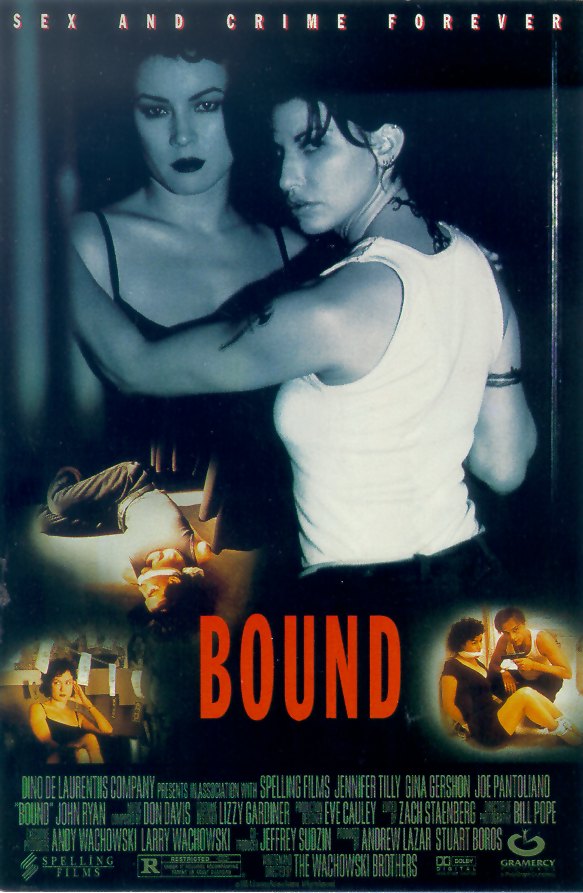 Darunter sind kleinere Szenen aus dem Film abgebildet, die weitere Einblicke in die Handlung geben. Eine Szene zeigt eine gefesselte Frau, die offensichtlich in einer gefährlichen Situation steckt, während eine andere eine Szene mit den beiden Hauptfiguren in einer intimen, aber auch bedrohlichen Pose darstellt. Der Titel "BOUND" in leuchtendem Rot bildet einen starken Kontrast zum dunklen Hintergrund und zieht sofort die Aufmerksamkeit auf sich.