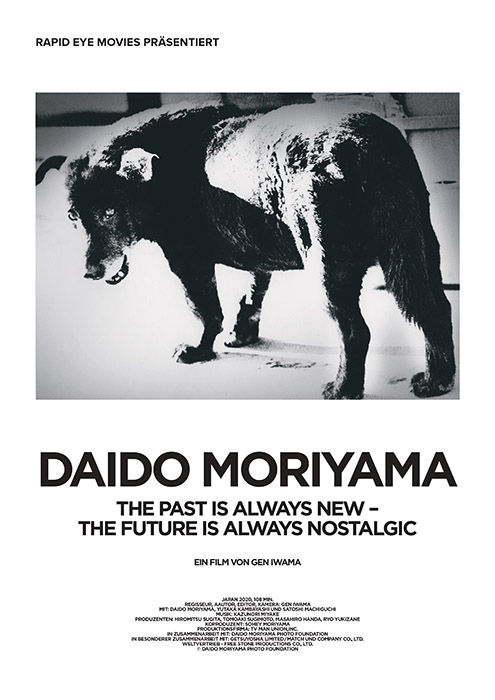 Der Titel des Films, "DAIDO MORIYAMA", ist in großer, fetter Schrift hervorgehoben. Darunter steht der Untertitel: "THE PAST IS ALWAYS NEW – THE FUTURE IS ALWAYS NOSTALGIC". Dieser Slogan spiegelt die Themen wider, die oft in Moriyamas Werk zu finden sind: die Auseinandersetzung mit Erinnerung, Zeit und der ständigen Veränderung der Wahrnehmung.