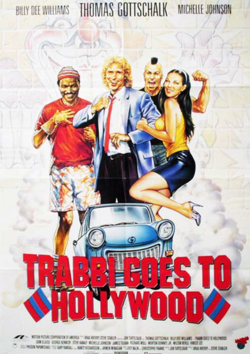 Die Besetzung, darunter Billy Dee Williams, Thomas Gottschalk und Michelle Johnson, wird prominent am oberen Rand des Plakats genannt. Die gesamte Komposition vermittelt einen Eindruck von Humor, Abenteuer und dem Aufeinandertreffen unterschiedlicher Kulturen, verkörpert durch den Trabant und die Hollywood-Kulisse. Die lebhaften Farben und die dynamischen Posen der Charaktere deuten auf eine unterhaltsame und möglicherweise chaotische Geschichte hin.