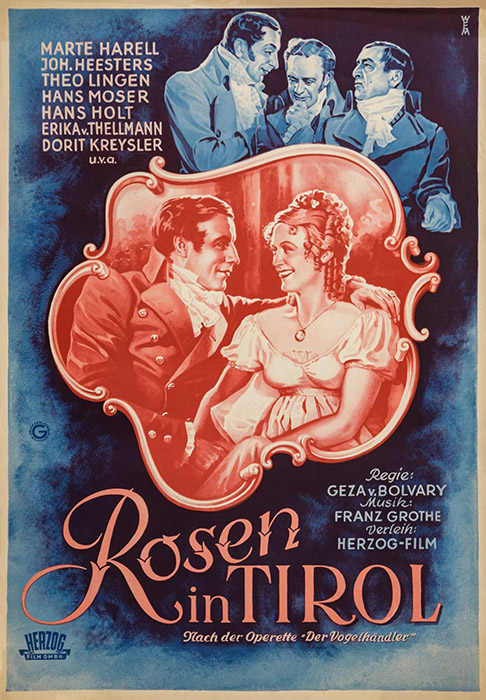 Die Namen der Hauptdarsteller sind prominent am oberen linken Rand aufgeführt, darunter Marte Harell und Johannes Heesters, was auf die Bedeutung dieser Schauspieler für den Film hinweist. Unten rechts sind die Regie (Geza von Bolvary), die Musik (Franz Grothe) und der Verleih (Herzog-Film) angegeben. Der Untertitel "Nach der Operette 'Der Vogelhändler'" verrät, dass der Film auf einer bekannten Operette basiert, was auf eine musikalische und unterhaltsame Geschichte schließen lässt.