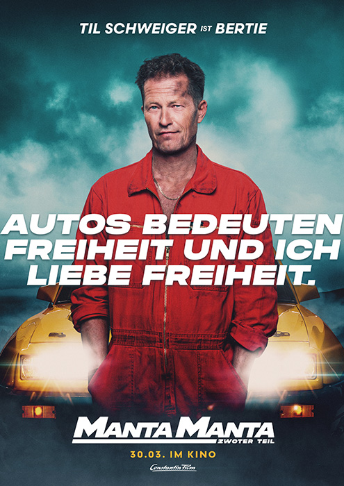 Das Plakat deutet auf einen Film hin, der sich um Autos, Freiheit und möglicherweise um die Charaktere und ihre Lebensweise dreht, die eng mit diesen Elementen verbunden sind. Der Titel "Manta Manta - Zwoter Teil" und das Erscheinungsdatum "30.03. IM KINO" sowie das Logo von Constantin Film geben klare Informationen über den Film und seine Veröffentlichung.