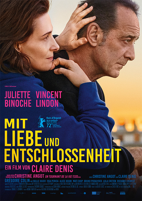 Der Titel "Mit Liebe und Entschlossenheit" ist in kräftigen, gelben Buchstaben hervorgehoben, was die zentrale Thematik des Films – die Kraft von Liebe und Entschlossenheit angesichts von Herausforderungen – unterstreicht. Die Nennung der Hauptdarsteller und der Regisseurin Claire Denis, zusammen mit der Auszeichnung "Ours d'Argent" der Berlinale, signalisiert die künstlerische Qualität und die Anerkennung des Films.