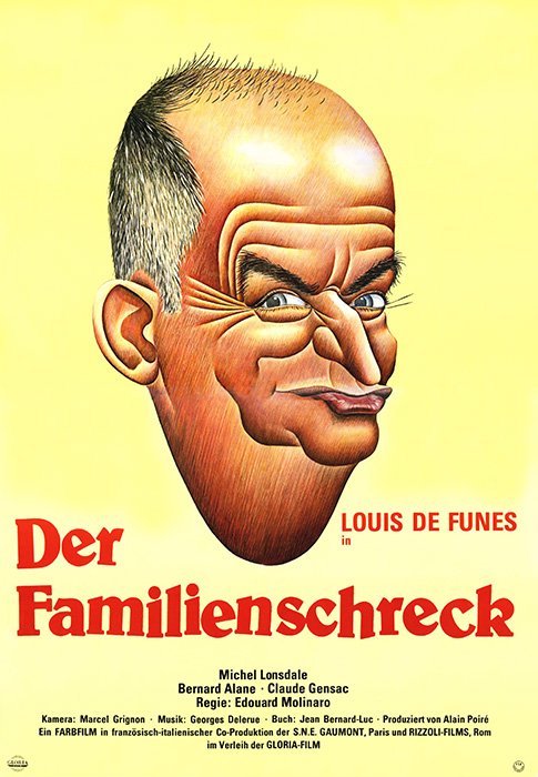 Das zentrale Element des Plakats ist ein großformatiges, stilisiertes Porträt von Louis de Funès, das von oben gezeigt wird. Sein Gesicht ist stark verzerrt und karikiert, mit einer hervorstehenden Nase, tief liegenden Augen, die von Falten umgeben sind, und einem leicht schiefen Mund. Die Haare sind spärlich und gehen in eine hohe Stirn über, die von tiefen Furchen durchzogen ist. Die Zeichnung ist detailreich und verwendet kräftige Linien und Schattierungen, um die charakteristischen Gesichtszüge von de Funès hervorzuheben und seine komödiantische Energie einzufangen.