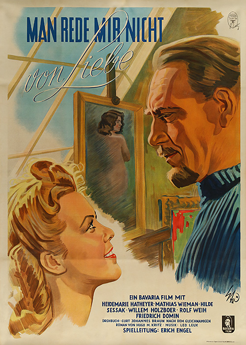 Dieses Filmplakat für "Man rede mir nicht von Liebe" zeigt eine dramatische und emotionale Szene zwischen einem Mann und einer Frau. Die Frau, im Vordergrund links, blickt mit einem hoffnungsvollen und leicht sehnsüchtigen Ausdruck zu dem Mann auf. Ihre blonden Haare sind kunstvoll hochgesteckt, und ihr Gesicht ist hell beleuchtet, was ihre Jugend und Schönheit betont.