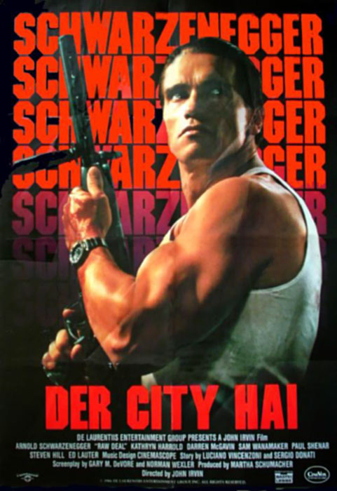 Dieses Filmplakat für "Der City Hai" (Originaltitel: Raw Deal) zeigt Arnold Schwarzenegger in seiner typischen Actionhelden-Pose. Er ist in Nahaufnahme dargestellt, mit einem entschlossenen Blick und einer Waffe in der Hand. Der Hintergrund ist mit dem Namen "SCHWARZENEGGER" in großen, roten Buchstaben wiederholt, was seine zentrale Rolle im Film hervorhebt und eine starke visuelle Wirkung erzielt.