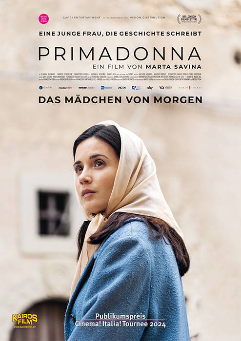 Dieses Filmplakat bewirbt den Film "Primadonna - Das Mädchen von morgen". Im Mittelpunkt steht eine junge Frau, die nachdenklich und entschlossen in die Ferne blickt. Ihr Kopftuch und ihre Kleidung deuten auf eine traditionelle oder historische Kulisse hin, während ihr Blick eine moderne Stärke und Zielstrebigkeit vermittelt.