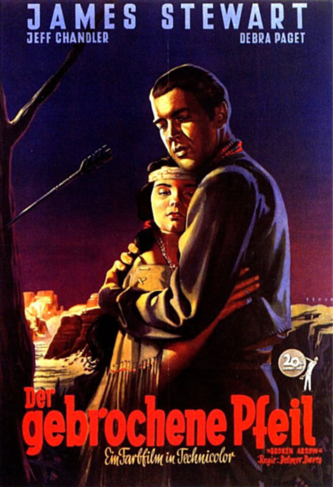 Dieses Filmplakat für "Der gebrochene Pfeil" zeigt eine dramatische und emotionale Szene, die die zentrale Beziehung des Films andeutet. Im Vordergrund umarmen sich James Stewart und Debra Paget. Stewart, in einer robusten Kleidung, hält Paget, die eine traditionelle indianische Kleidung trägt, schützend. Ihr Gesichtsausdruck ist ernst und nachdenklich, während er sie fest an sich drückt.