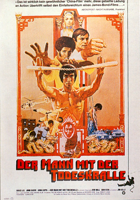 Insgesamt kommuniziert das Plakat die Themen des Films: Martial Arts, Kampf, Ehre und die Überwindung von Widrigkeiten. Es ist ein klassisches Beispiel für ein Filmplakat, das darauf abzielt, das Publikum mit einer Mischung aus Action, Star-Power und einem Hauch von Mysterium anzuziehen. Der deutsche Untertitel "Der Mann mit der Todeskralle" ist prominent platziert und macht den Film sofort erkennbar.