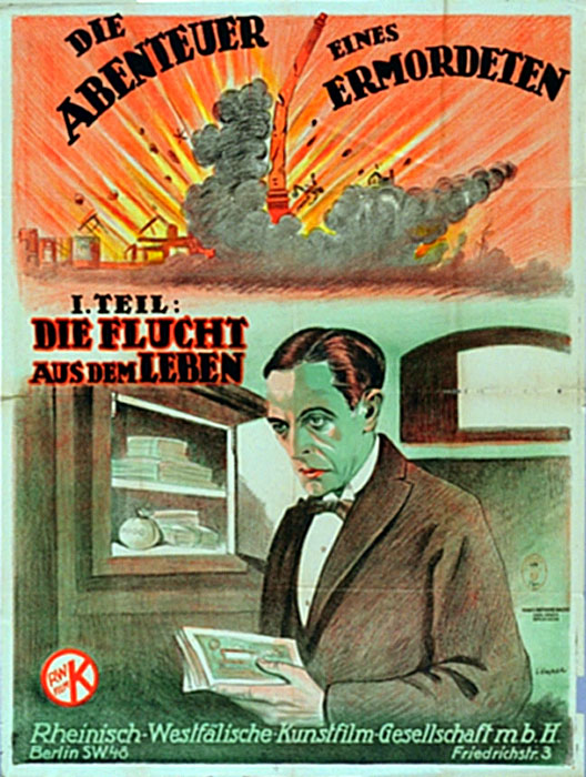 Dieses Filmplakat für "Die Abenteuer eines Ermordeten - 1. Teil: Die Flucht aus dem Leben" ist ein eindringliches Beispiel für die visuelle Gestaltung von Stummfilmplakaten.