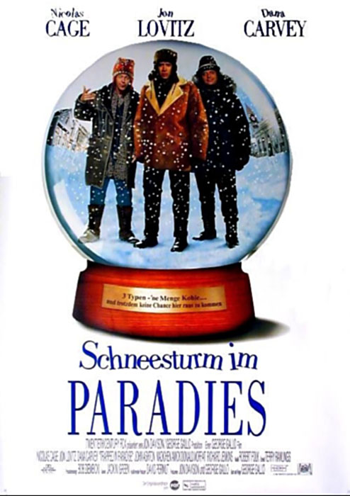 Dieses Filmplakat bewirbt den Film "Schneesturm im Paradies" und zeigt die Hauptdarsteller Nicolas Cage, Jon Lovitz und Dana Carvey. Sie sind innerhalb einer Schneekugel dargestellt, die mit fallendem Schnee gefüllt ist. Die Darsteller tragen Winterkleidung, was auf die winterliche Thematik des Films hindeutet. Unter der Schneekugel befindet sich ein Holzsockel mit einer goldenen Plakette, auf der eine deutsche Textzeile steht: "3 Typen - 'ne Menge Kohle... und trotzdem keine Chance hier raus zu kommen". Dies deutet auf eine komödiantische Handlung hin, bei der die Charaktere in einer schwierigen oder festgefahrenen Situation gefangen sind. Der Filmtitel "Schneesturm im Paradies" ist prominent in blauer Schrift darunter platziert. Das Design der Schneekugel als zentrales Element des Plakats vermittelt eine isolierte oder eingeschlossene Atmosphäre, die im Kontrast zum "Paradies" im Titel steht und auf die komischen Umstände der Charaktere hinweist.
