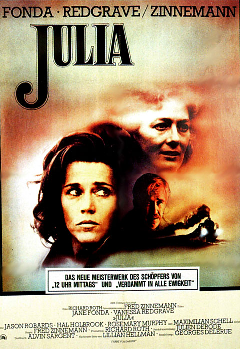 Der Titel "JULIA" ist in großen, serifenbetonten Buchstaben in der oberen Mitte des Plakats platziert, was ihm eine zentrale Bedeutung verleiht. Die Namen der Hauptdarstellerinnen, Fonda und Redgrave, sowie des Regisseurs Zinnemann sind prominent darüber aufgeführt.